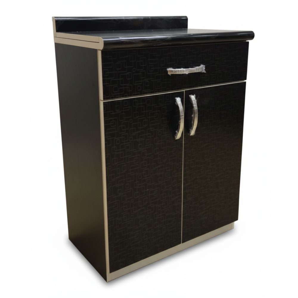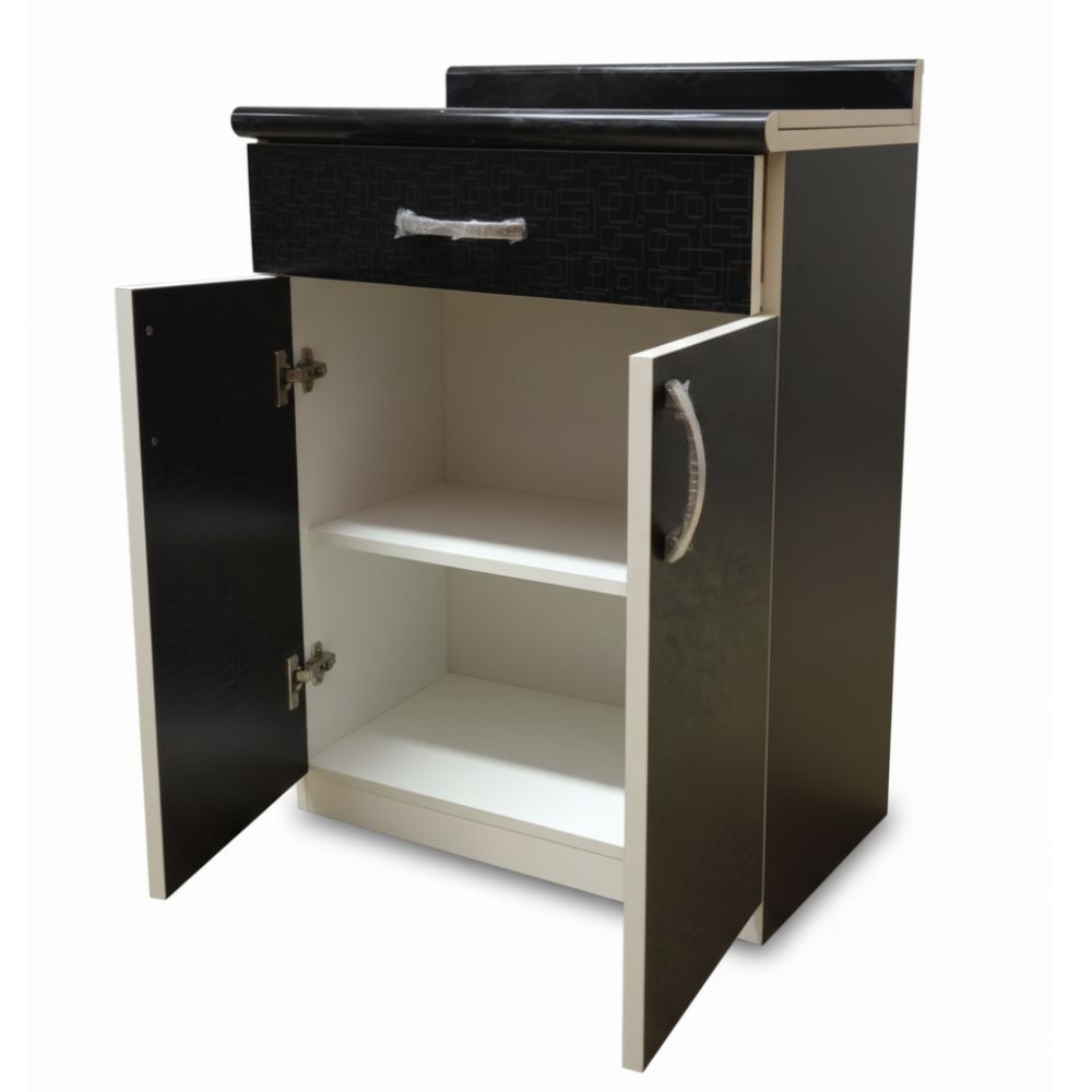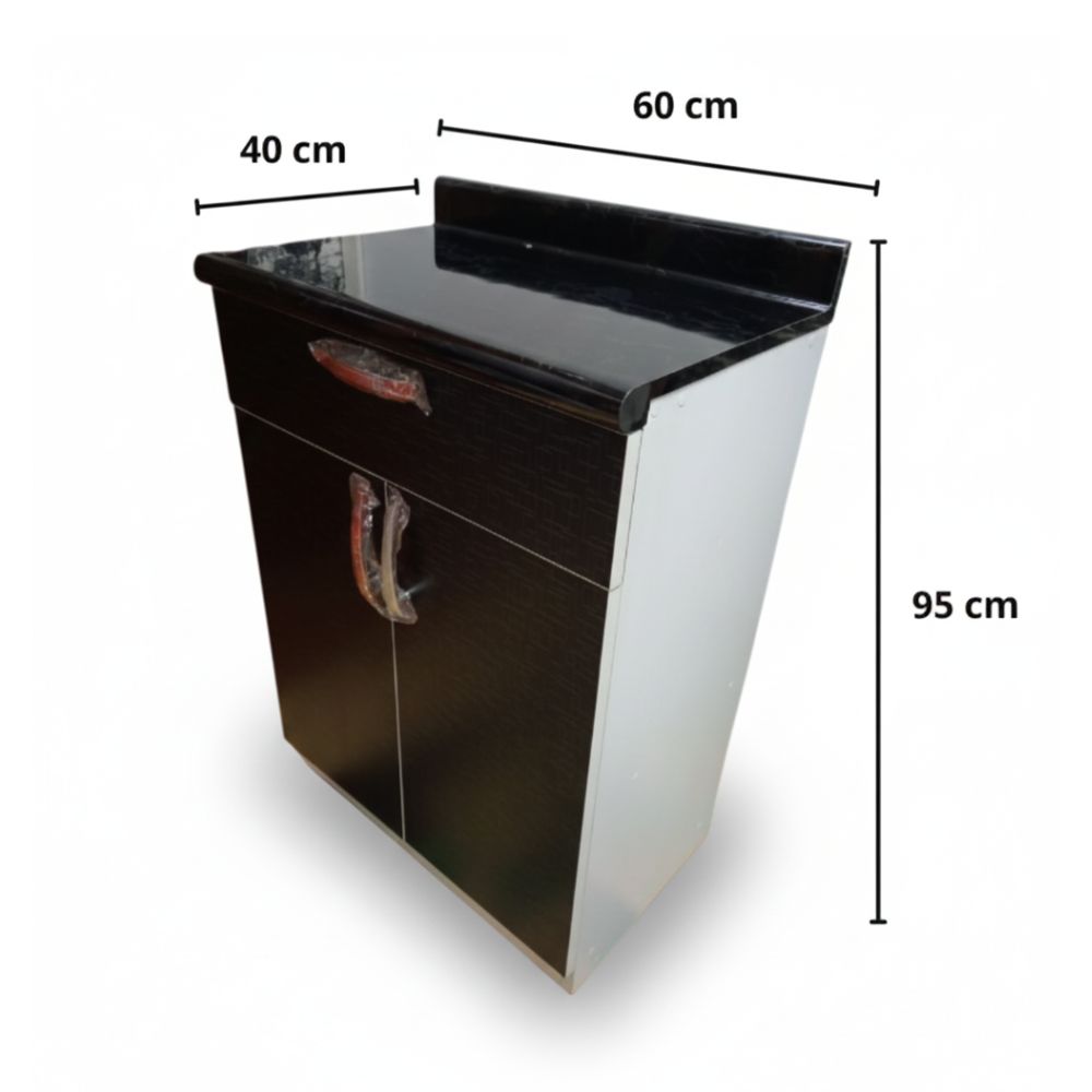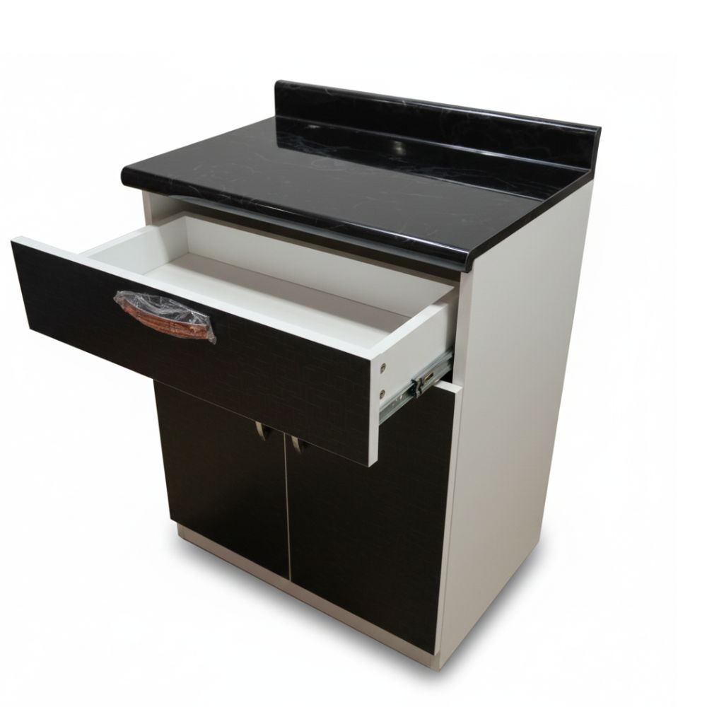 Cuenta con un cajón superior central con rieles telescópicos, que permite un deslizamiento suave y silencioso, ideal para guardar cubiertos o utensilios pequeños. En la parte inferior incorpora un amplio compartimiento con 2 divisiones internas y puertas, perfecto para almacenar alimentos, ollas o vajilla.