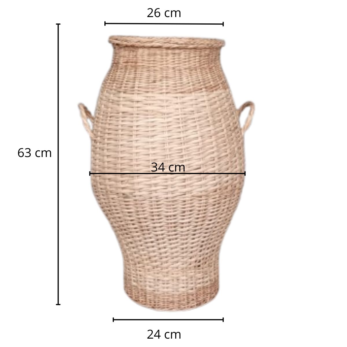 Dimensiones: Altura total de 63 cm. Diámetro de la boca superior: 26 cm. Base inferior: 24 cm. Ancho total con asas: 34 cm.